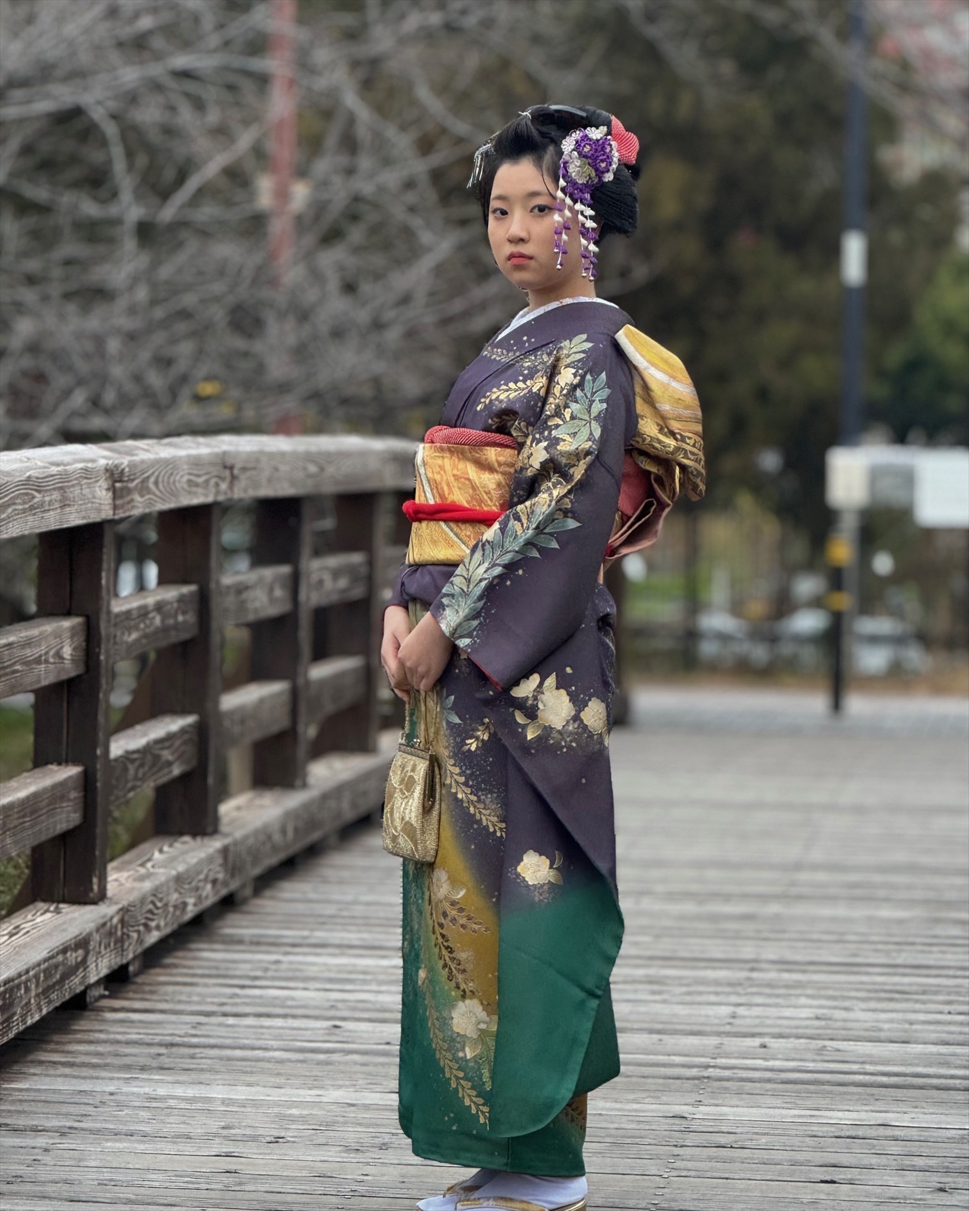 全身のお写真を拝見しても、全体にすごくバランスが良く、ハレの日の装いです。お袖やお裾に緑のグラデーションが可愛らしい中に、大人っぽさを感じさせる色合いです。
